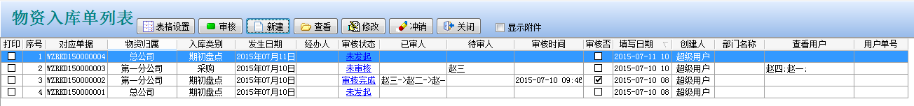 點擊主菜單中的【行政物資】->【物資入庫單】打開物資入庫單列表 點【新建】按鈕,錄入如下: