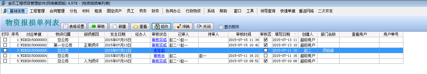 【物資報損單】是用來報損物資的業務單據。 類似【材料報損單】或者【設備報損單】,一個是針對物資報損,一個是針對材料或者設備報損。