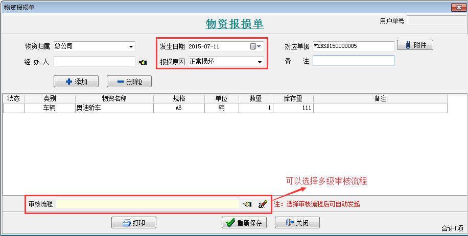 備注:當借出的物資發生損壞,必須填寫物資歸還單后才可以執行報損。