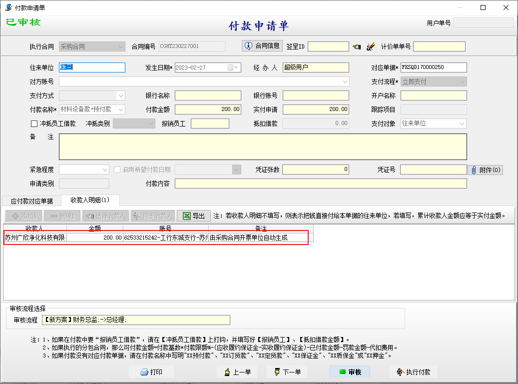 編輯合同時,選擇開票單位,合同付款時,收款人明細中自動帶入開票單位收款信息。如下圖所示: