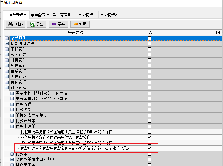 3、付款申請單和付款單付款名稱只能選擇系統設定的內容不能手動錄入”