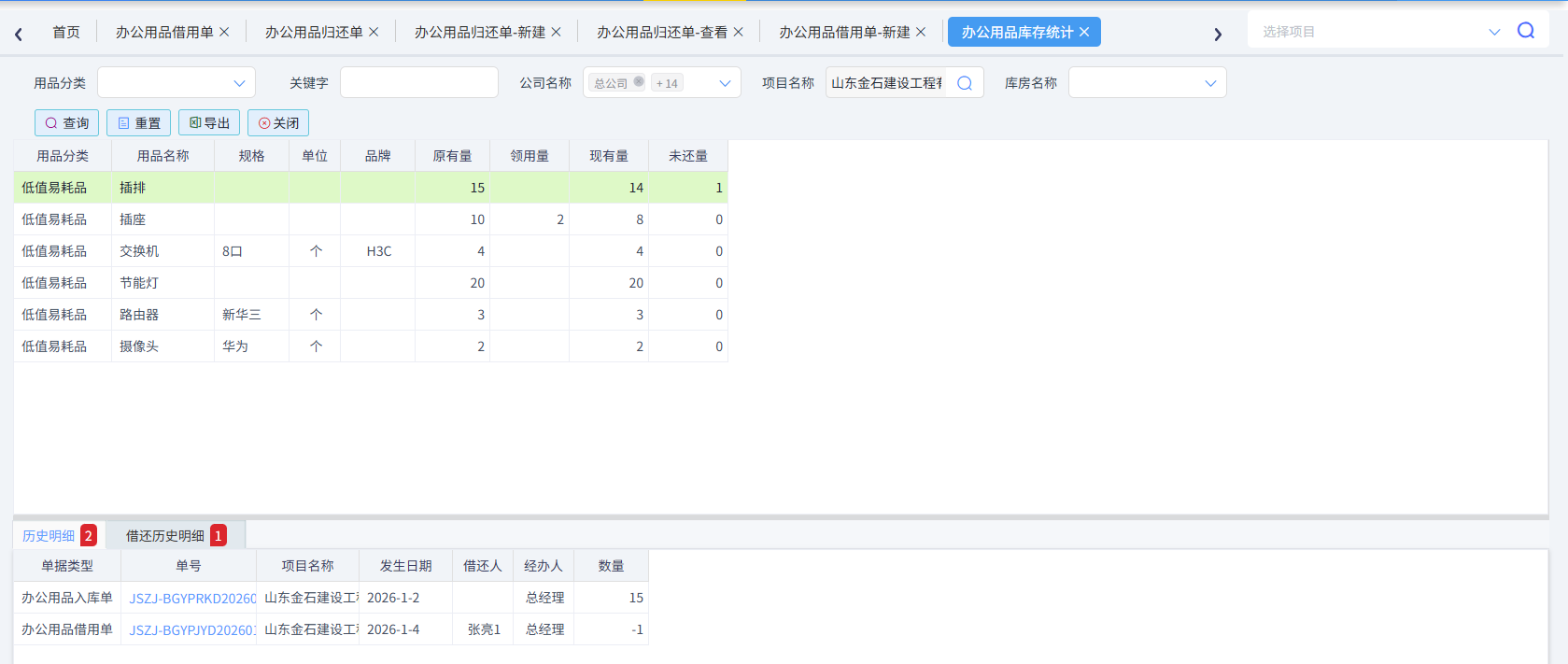辦公用品統(tǒng)計(jì),此查詢(xún)可看到項(xiàng)目中的用品庫(kù)存情況,如入庫(kù)量、領(lǐng)用量、現(xiàn)存量、未還量等,如下圖所示,