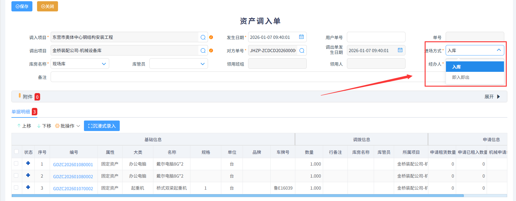 資產(chǎn)調(diào)入是指企業(yè)將資產(chǎn)從其他項目、部門或倉庫轉(zhuǎn)入特定使用地點的流程,資產(chǎn)調(diào)入單須通過已審核的資產(chǎn)調(diào)出單生成,生成過程中調(diào)入方可根據(jù)實際情況選擇入庫和即入即出(此選項不進入庫房,領(lǐng)用無需出庫)