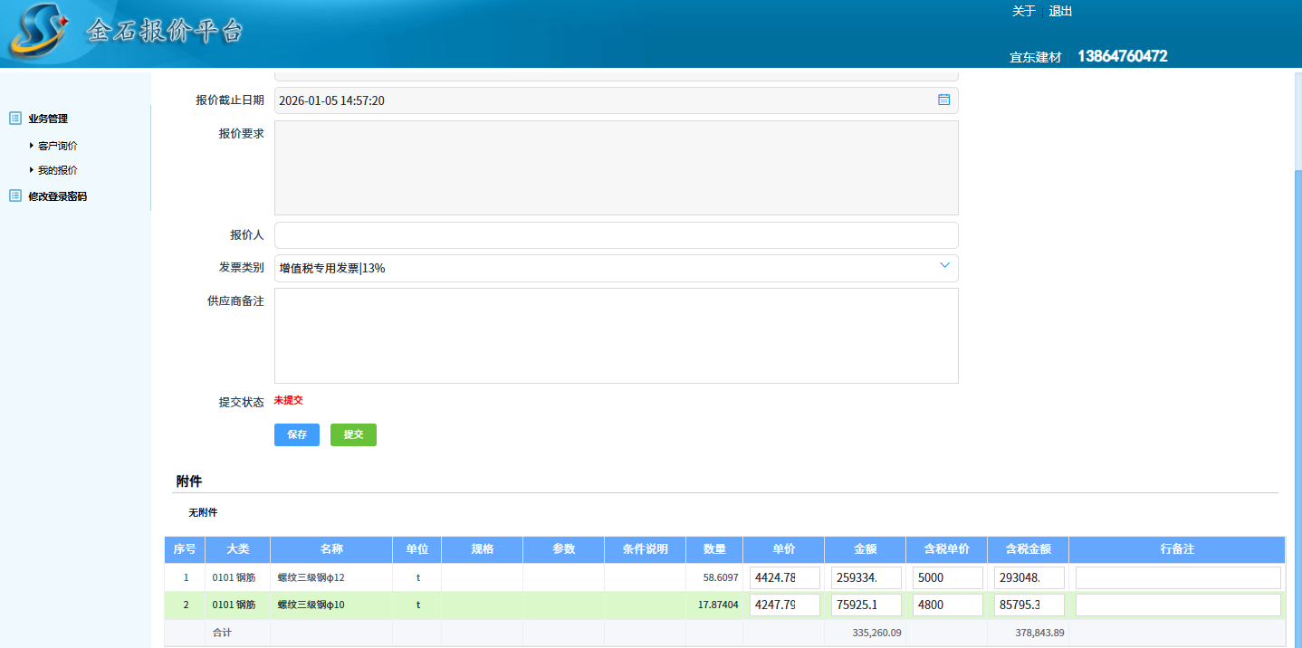 材料詢價單審批完成之后可以自動發送短信給供應商,供應商根據短信提示直接在金石報價平臺進行報價。