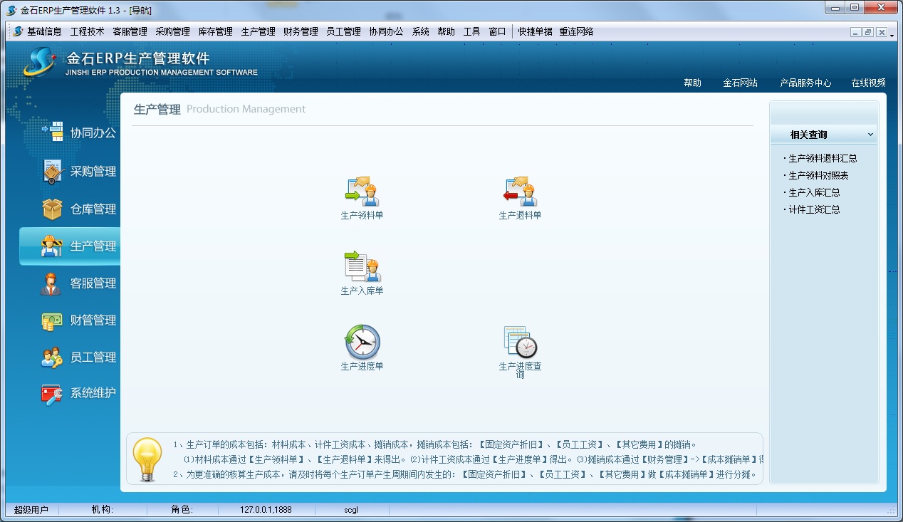 生產(chǎn)管理主要管理由客戶訂單下達生產(chǎn)計劃、生產(chǎn)車間領(lǐng)料、生產(chǎn)工序交接、生產(chǎn)進度填報、生產(chǎn)退料、生產(chǎn)入庫等。