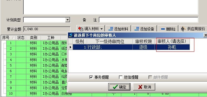 審核方案選好后,點保存按鈕保存單據,這是會彈出待審人選擇窗口,如下圖,這時我們要選擇好下一級的審核人,選擇好后,那么該用戶就是業務單據的待審人。在審核中心和業務單據列表中就可以看到該業務單據。