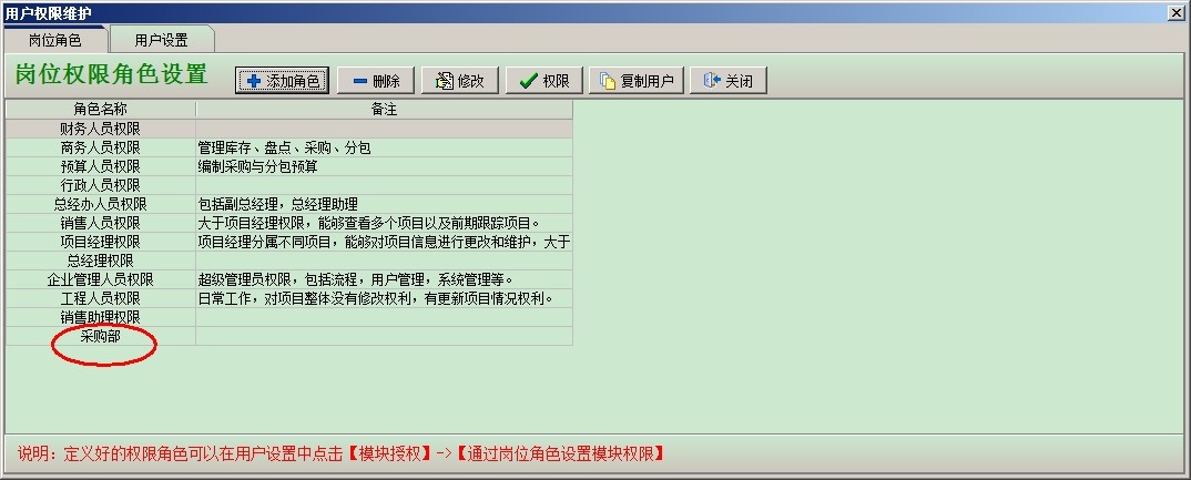 設置采購部這個角色的【權限】