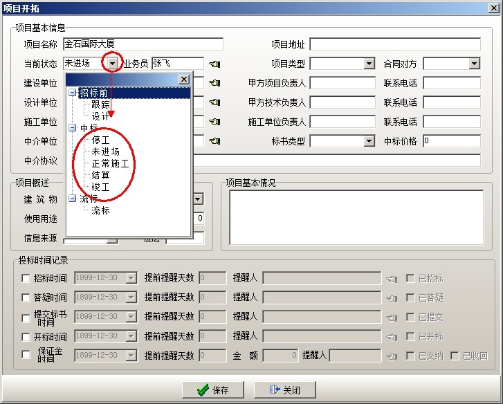 (1)需要再回到【項目開拓】中修改項目開拓的狀態(tài)為中標的狀態(tài)(中標下的五個狀態(tài)任選一項),然后保存
