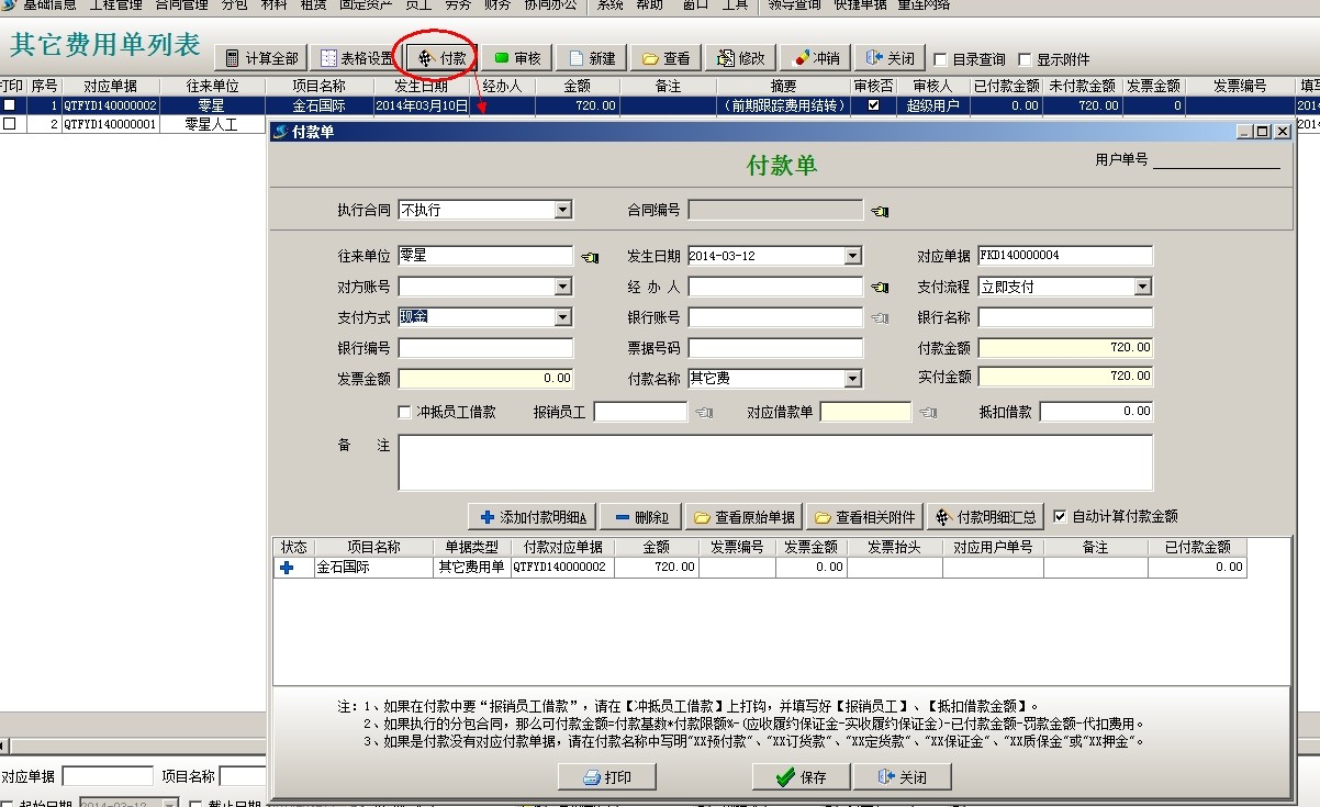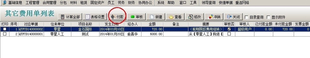 選中單據(jù)點擊付款,選擇支付方式,點保存。項目開拓中可以查看到該投標項目發(fā)生的費用